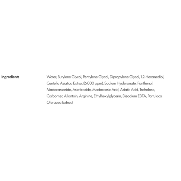 Water, Butylene Glycol, Pentylene Glycol, Dipropylene Glycol, 1,2-Hexanediol, Centella Asiatica Extract(6,000 ppm), Sodium Hyaluronate, Panthenol, Madecassoside, Asiaticoside, Madecassic Acid, Asiatic Acid, Trehalose, Carbomer, Allantoin, Arginine, Ethylhexylglycerin, Disodium EDTA, Portulaca Oleracea Extract